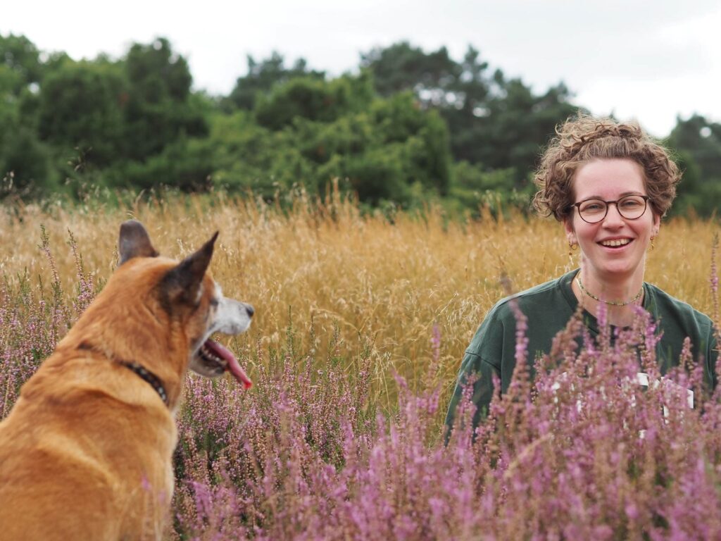 Hund in der Heide fotografiert bei Sonnenuntergang